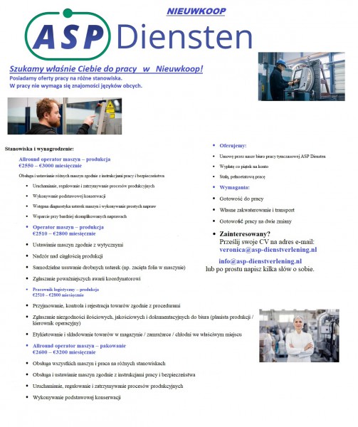 Dla naszego klienta w miejscowości Nieuwkoop poszukujemy kandydatów na stanowisko: