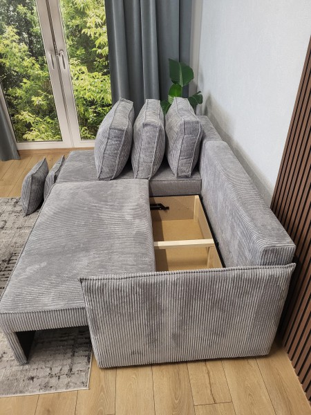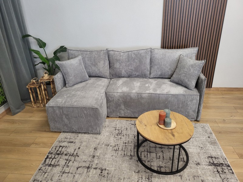 Mały rozkładany sztruksowy narożnik z funkcją spania i pojemnikiem na pościel. Nowoczesny, prosty i wygodny. Wykończony przyjemną w dotyku tkaniną, która jest bestsellerem tego roku. Od Benet I odróżniają go grubsze boczki stabiizujące.