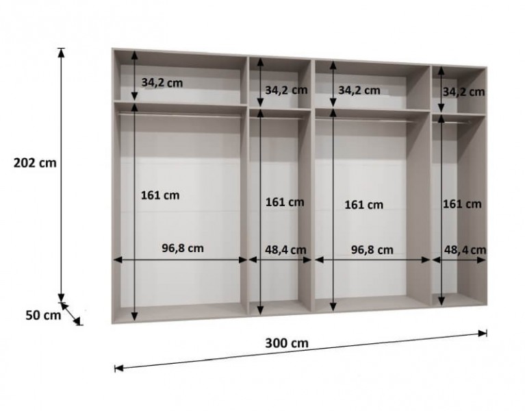 Propozycja dedykowana dla tych, którzy nie są zwolennikami szaf przesuwnych. Szafa uchylna z lustrem ALICANTE 300cm to propozycja dedykowana do przedpokoju lub sypialni. Przemyślane i bardzo pojemne wnętrze pomieści wiele ubrań na każdy sezon. Wyposażona w drążki na ubrania wiszące oraz półkę na dodatki.