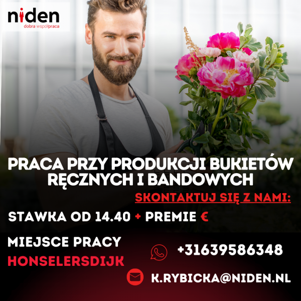 PRACA PRZY PRODUKCJI BUKIETÓW RĘCZNYCH I BANDOWYCH- 14.40 + Premie -Honselersdijk