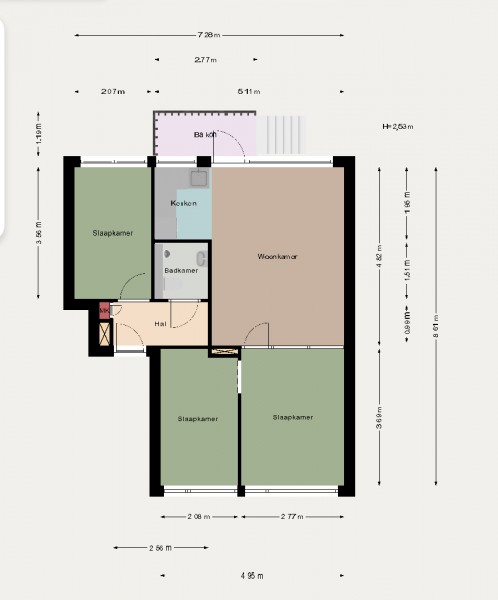 Układ mieszkania: salon, kuchnia, trzy sypialnie, łazienka, balkon oraz ogród.