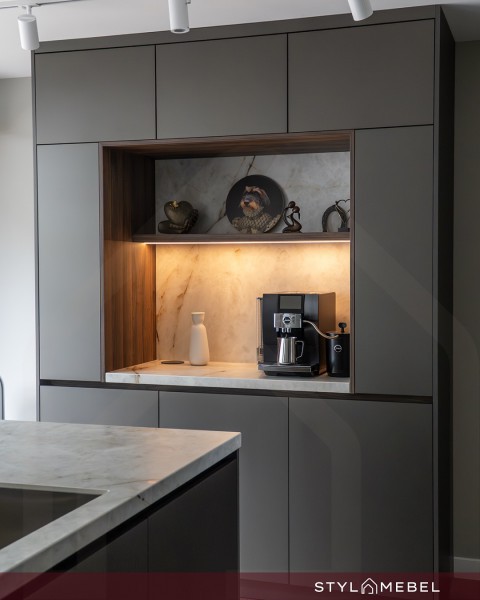 Matowe fronty w kolorze Titano MAT w połączeniu z ciepłym dekorem drewna i marmurowymi akcentami tworzą elegancką, ponadczasową całość.