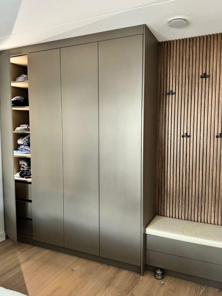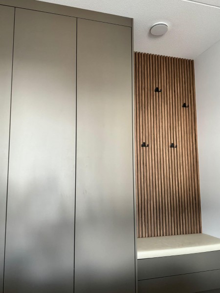 Lamele z haczykami zapewniają stylowe miejsce na kurtki, a wbudowane siedzisko dodaje komfortu przy zakładaniu butów.