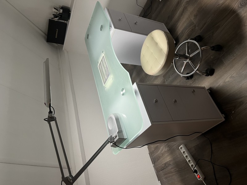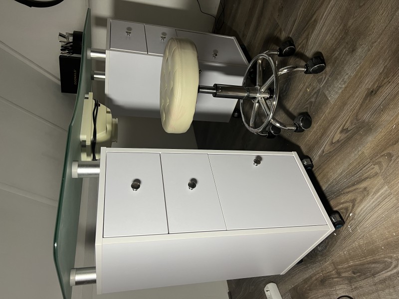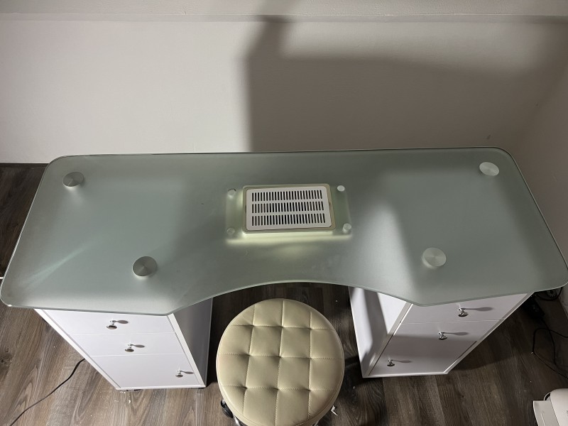 Witam, mam na sprzedaż luksusowy stolik do manicure, ze szklanym blatem. Plus dwa krzesła . Piękny szklany blat sprawia, że ten luksusowy stolik do manicure doskonale nadaje się do pracy z płynami żrącymi. Po obu stronach stolika znajdują się praktyczne szuflady do przechowywania produktów i akcesoriów. Stolik do manicure jest wyposażony w podłokietnik dla klientki, wbudowany odciąg pyłu oraz 8 obrotowych kółek (z hamulcami) dla łatwego przemieszczania. Materiał: drewno (MDF) i szkło