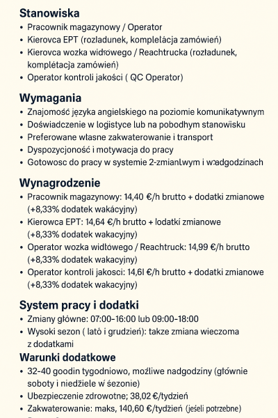 Pracownik magazynowy: 14,40 €/h brutto + dodatki zmianowe (+8,33% dodatek wakacyjny)