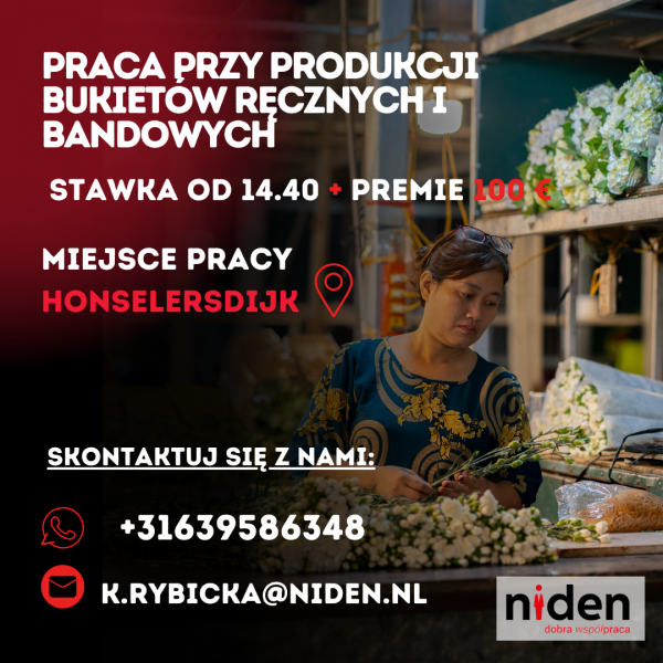 Nasz klient to dynamicznie rozwijająca się firma z siedzibą w Honselersdijk, specjalizująca się w produkcji i sprzedaży bukietów kwiatowych. Obecnie poszukujemy pracowników do pracy przy bukietach ręcznych oraz bandowych (układanych maszynowo).