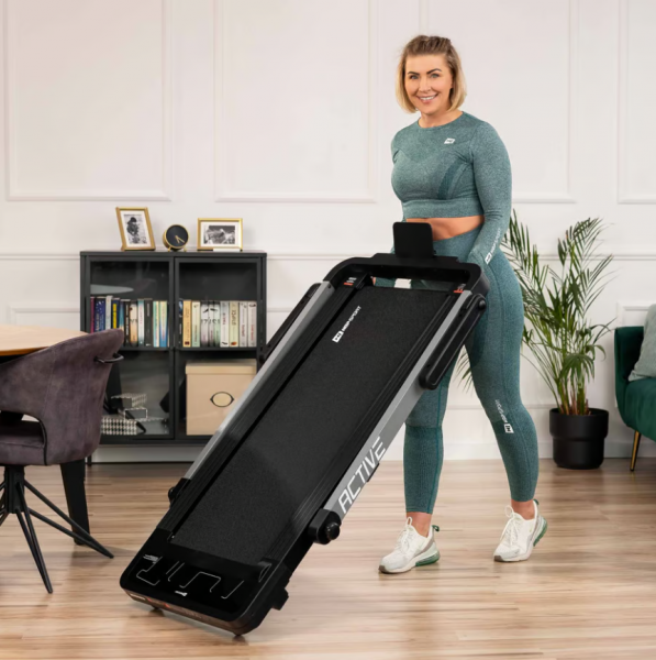 Bieżnia treningowa HS-1300WLB Active jest sprzętem fitness zaprojektowanym do domowego użytku, dlatego posiada szereg udogodnień, takich jak kółka transportowe czy bezpieczny system składania safety lock. Rolki transportowe gwarantują bezwysiłkowe przesuwanie sprzętu po zakończonym treningu, oraz chronią podłogę przed zarysowaniami. Składanie „na płasko” ułatwia przechowywanie bieżni pod łóżkiem lub przy ścianie.
