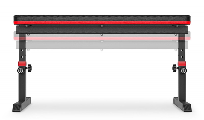 Wysokość ławki możesz dostosować do wzrostu ćwiczącego. Regulacja jest bardzo prosta - wystarczy odkręcić pokrętła znajdujące w podstawach, ustawić wysokość i zakręcić. Specjalne blokady zabezpieczają mechanizm przed osunięciem i zapewniają bezpieczeństwo w trakcie ćwiczeń.