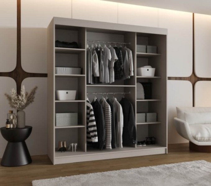 Mała przesuwna szafa z lustrem o szerokości 200cm w kolorze kaszmiru. Szafa ROBIN została wyposażona w pojemne półki oraz dwa poziomy drążków na ubrania wiszące.