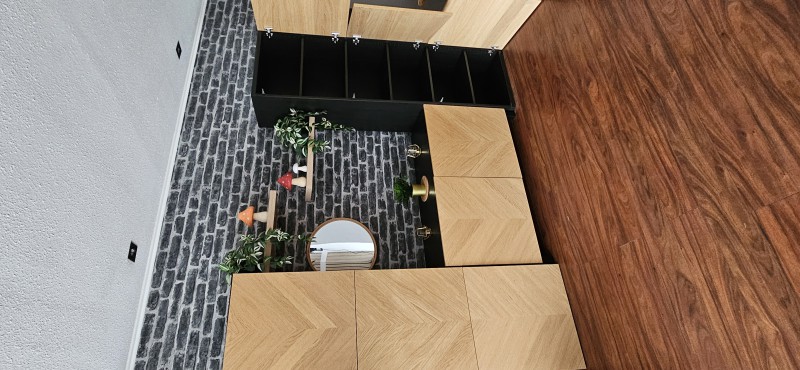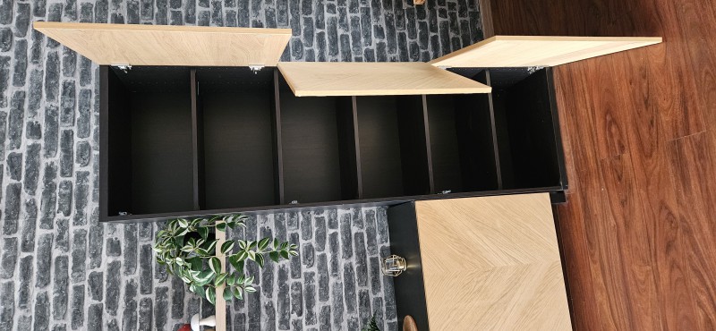 Fronty w kolorze dębu (wzór jodełka), boki i wnętrze w bardzo ciemnym brązie. Całość prezentuje się stylowo i pasuje do wielu wnętrz.