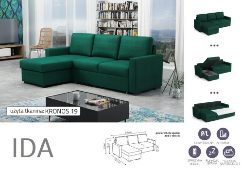 Ponadczasowy narożnik IDA z funkcją spania i pojemnikiem na pościel