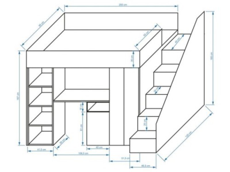 Łóżko piętrowe z biurkiem to mebel do wnętrza, gdzie chcemy dobrze zagospodarować przestrzeń. Duża powierzchnia łóżka piętrowego pozwala na swobodny wypoczynek oraz bezpieczne korzystanie z mebla. Poniżej znajdziemy biurko zapewniające miejsce do nauki które pod blatem posiada otwartą wnękę, a za drzwiczkami półkę na której można przechowywać podręczniki i książki. Na łóżko prowadzą wygodne, szerokie schody, a w nich pojemne szuflady w których przechowasz zabawki, bez odbierania miejsca w pokoju.