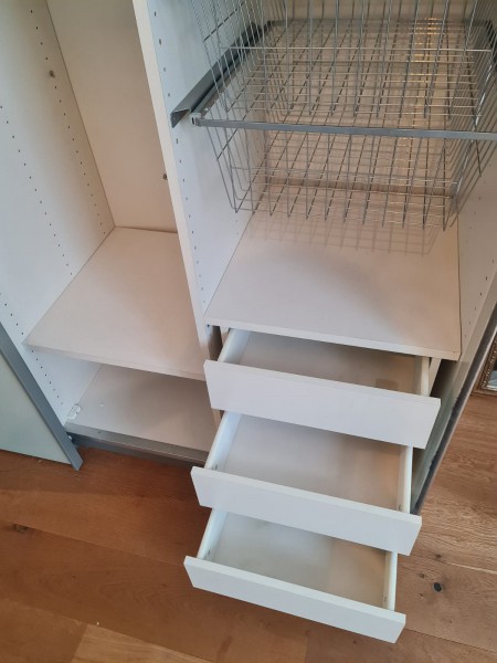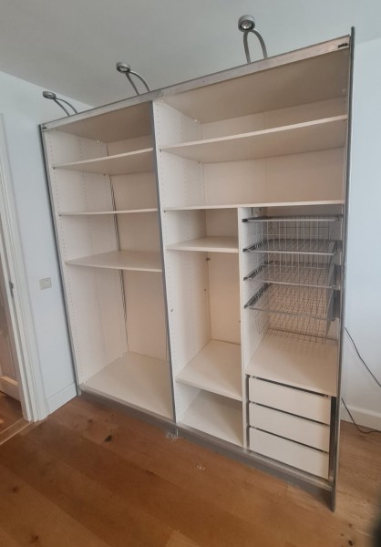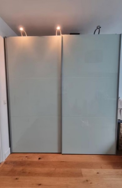 Ładna szafa o wymiarach: 200cm szeroka, 220cm wysoka i 60cm głęboka. W środku szuflady, kosze, półki i drążek na wieszaki. Drzwi wykonane z pełnej płyty meblowej na którą jest naklejone na froncie szkło. Więc drzwi są solidne i nie przezroczyste.Na górze oświetlenie, 3 lampki, wszystkie działają.