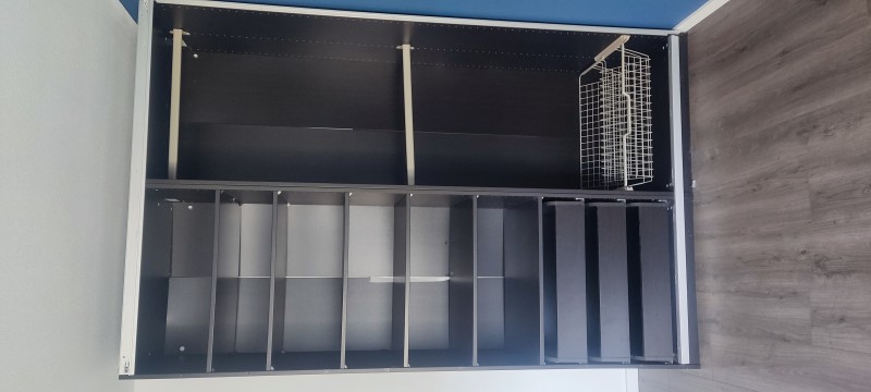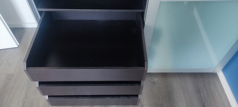 Szafa z popularnej i lubianej serii Ikea pax. Szafa ma 150cm szerokości, 236cm wysokości i 60cm głębokości. Dwoje drzwi ze szkłem mlecznym. W środku bardzo dużo półek, szuflady i 2 drążki na wieszaki. Stan szafy jest bardzo dobry, została fachowo zdemontowana, jest kompletna we wszystkie elementy.