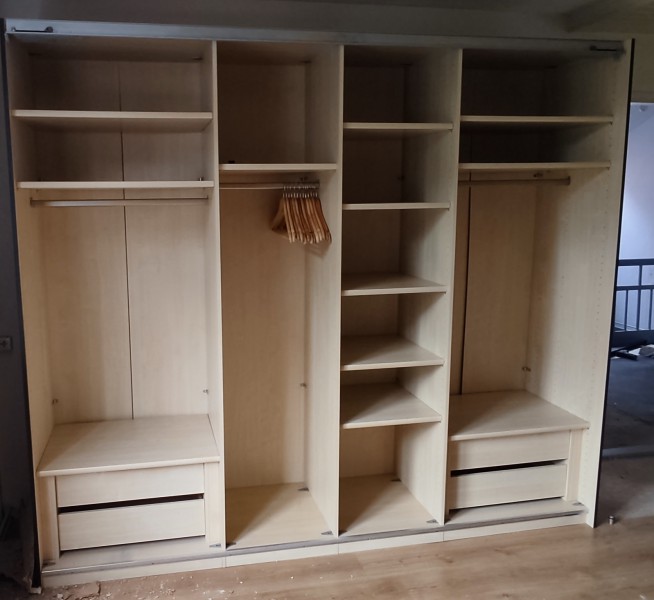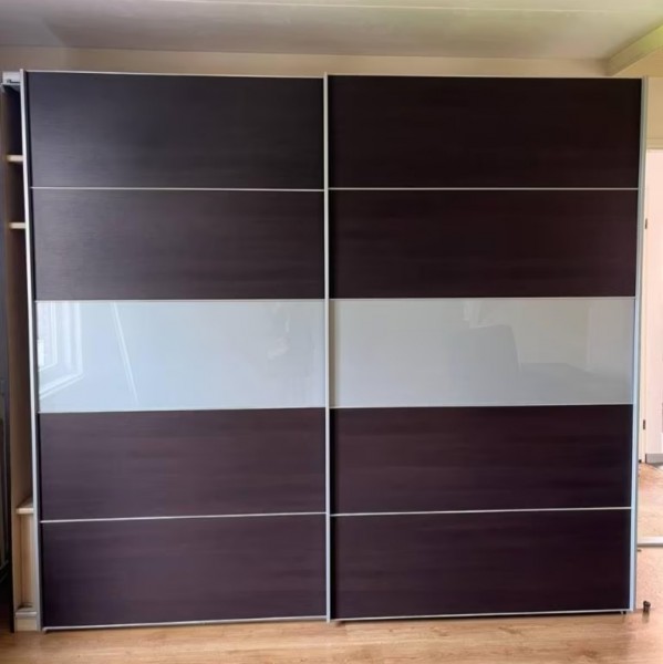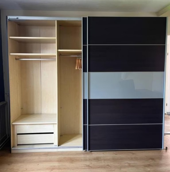 Ładna i przestronna szafa z dużą ilością półek. Szafa ma 250cm szerokości, jest 60cm głęboka i 212cm wysoka. Kolor wenge – bardzo ciemny brąz, w środku jasna. Bardzo dużo półek, 4 szuflady i drążki na wieszaki. Drzwi mają system cichego domyku! Szafa została fachowo zdemontowana, nie ma żadnych uszkodzeń i jest kompletna we wszystkie elementy.