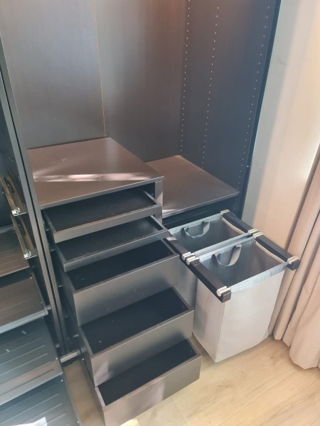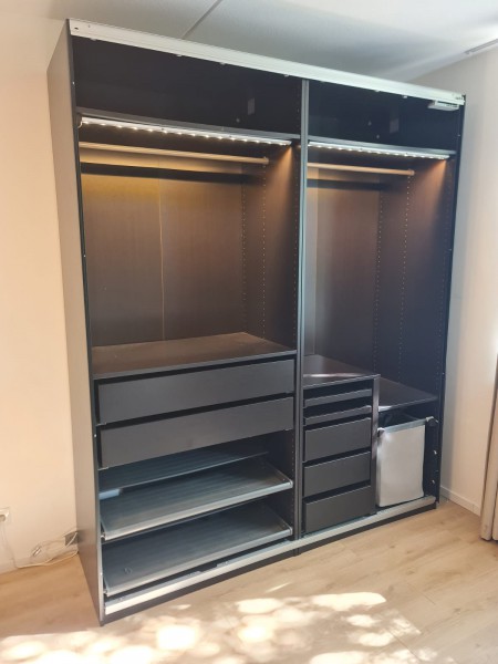 Szafa z popularnej i lubianej serii mebli ikea pax. Wymiary: 2.00m szerokości, wysokość 236cm, 60cm głęboka. Szafa ma swoje drzwi przesuwnych, z paneli że sklejki drewnianej pokrytych czymś na wzór bambusowej maty – wygląda to naprawdę pięknie! Korpusy i komponenty są w kolorze wenge, czyli bardzo ciemny brązowy. Szafa ma w środku dużo szuflad, półki, drążki na wieszaki, organizery na buty i organizery na biżuterię oraz wysuwane torby (np. na pranie). Dodatkowo na też oświetlenie LED z czujnikiem otwierania drzwi oraz system cichego domyku drzwi. Naprawdę świetnie zorganizowana garderoba z różnymi fajnymi komponentami. Szafa została fachowo zdemontowana, jest w bardzo dobrym stanie, jest kompletna we wszystkie elementy.