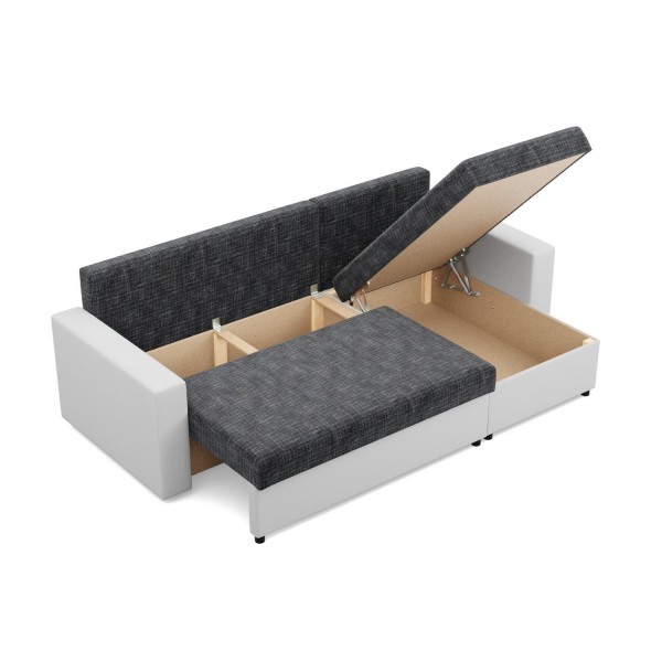 W pojemnikach w siedzisku możesz schować pościel i inne domowe przedmioty. To rozwiązanie sprawia, że zyskujesz wszechstronny, wolnostojący mebel wyposażony w trzy miękkie, sprężyste poduszki z pokrowcami na zamek. Każda poduszka narożnika jest luźna, więc możesz je dowolnie przekładać, aby siedzieć lub leżeć wygodnie podczas domowej imprezy czy seansu przed telewizorem.