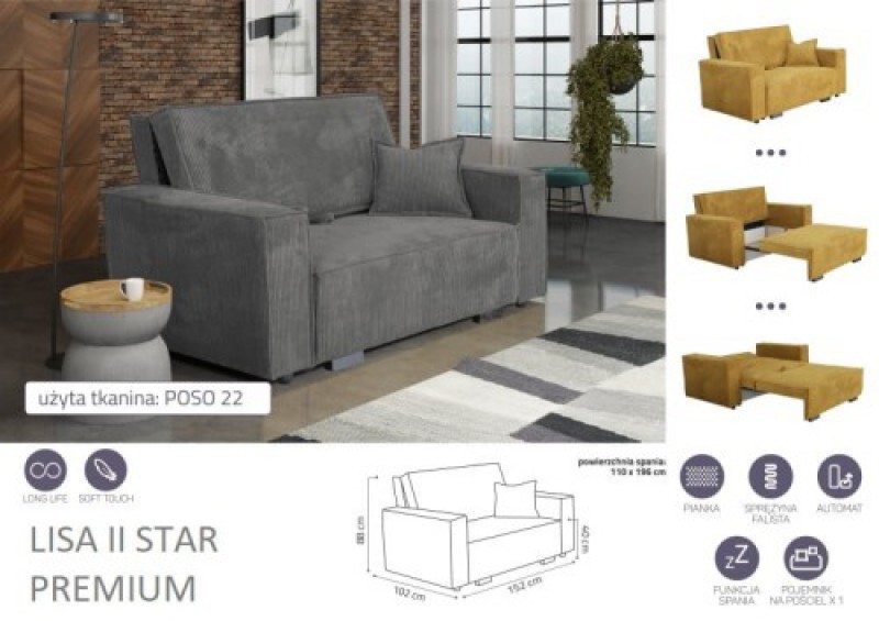 Automat ułatwiający rozkładanie gwarantuje lekkie i wygodne użytkowanie w codziennym życiu. Wypełnienie siedziska sprężyną i pianką zapewnia komfortowy sen i odpoczynek. Pojemnik na pościel ukryje rolę łóżka w Twoim salonie. Całość wykończona przyjemną w dotyku tkaniną sztruksową poso.