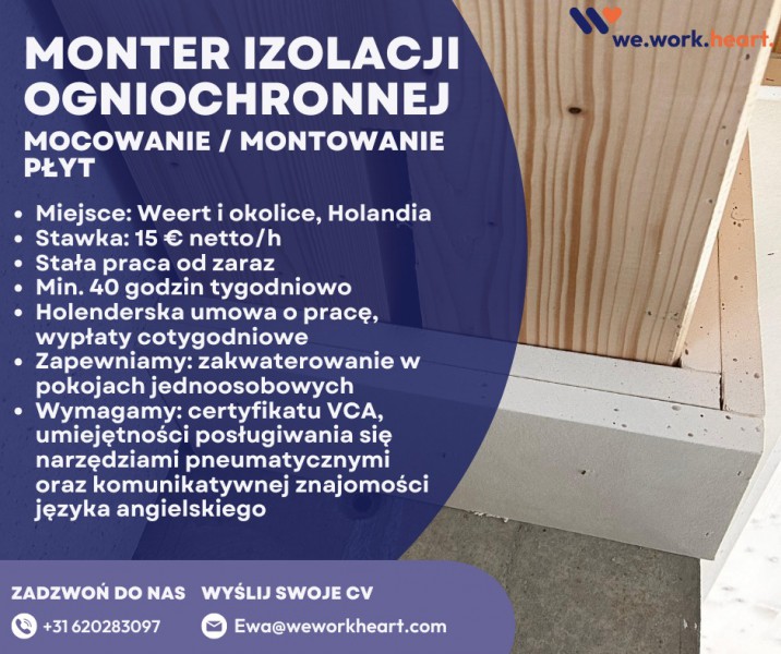 Poszukujemy kandydatów do pracy w miejscowości Eersel do firmy zajmującej się zabezpieczeniami pożarowymi wewnątrz bydunków. Często także pracownicy jeżdzą na różne projekty na terenie Holandii.