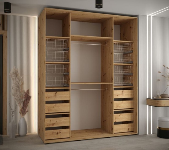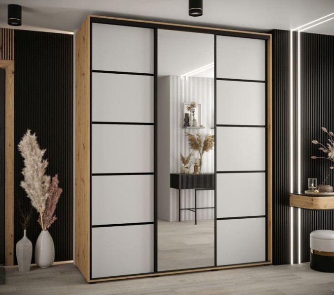 Jednym z elementów dla którego nie może zabraknąć miejsca w mieszkaniu jest pojemna szafa. Najlepiej jeśli będzie i pojemna, i pięknie wyglądać. CANON to mebel łączący w sobie właśnie pojemność, oraz elegancki styl. Wewnątrz prezentowanej szafy znajdują sie dwie lub trzy odrębne komory (w zależności od szerokości) wyposażone w drążki na wieszaki, oraz pojemne półki, a także szuflady na bieliznę, oraz metalowe koszyki(opcja dodatkowa). Czarne elementy, takie jak listwa w górnej części szafy, uchwyty, oraz nóżki dodają szafie charakteru. Możesz ją ustawić w salonie, sypialni, oraz przedpokoju. W każdym z tych pomieszczeń na pewno będzie przykuwać wzrok gości. W szafie zastosowano przesuwne drzwi na prowadnicach firmy BIMARK, dzięki czemu po otwarciu szafy nie potrzeba dodatkowego miejsca na fronty. Nie będzie kolidować z innymi meblami, a także świetnie się sprawdzi w wąskim przedpokoju.