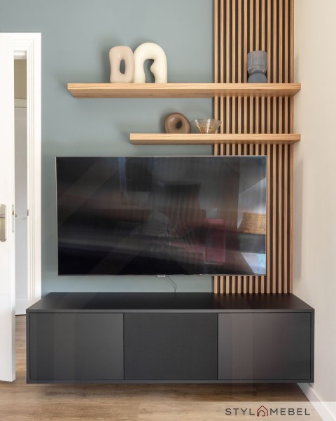 Zabudowa RTV, w której czerń spotyka się z naturalnym fornirem.