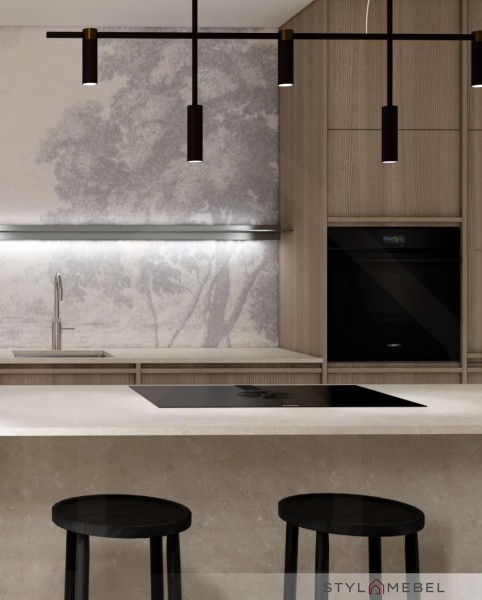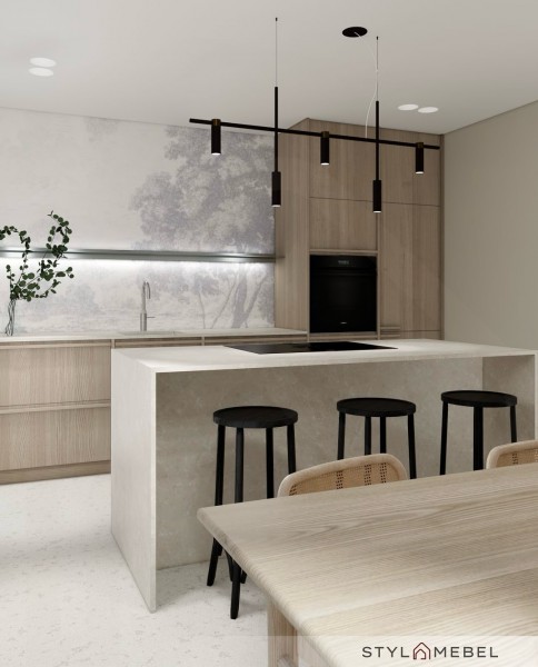 Tutaj prezentujemy kuchnię i sypialnię w nowoczesnym stylu – naturalne drewno, kamień, ciepłe oświetlenie i minimalistyczna elegancja.