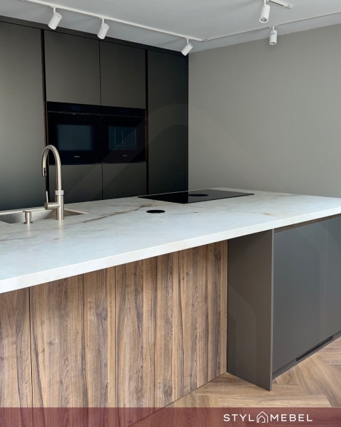 Matowe fronty w kolorze Titano MAT w połączeniu z ciepłym dekorem drewna i marmurowymi akcentami tworzą elegancką, ponadczasową całość.