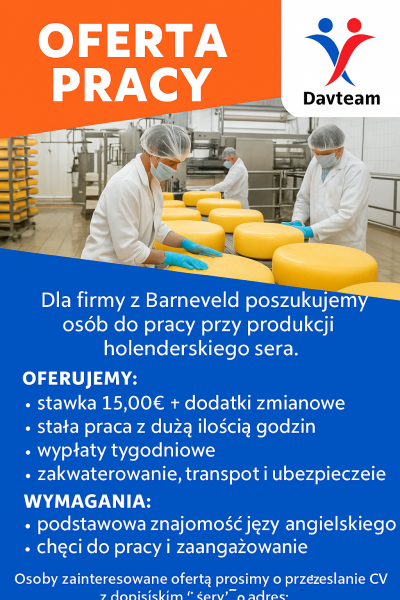 Dla firmy z Hoogeveen produkującej sery poszukujemy pracowników produkcyjnych.
