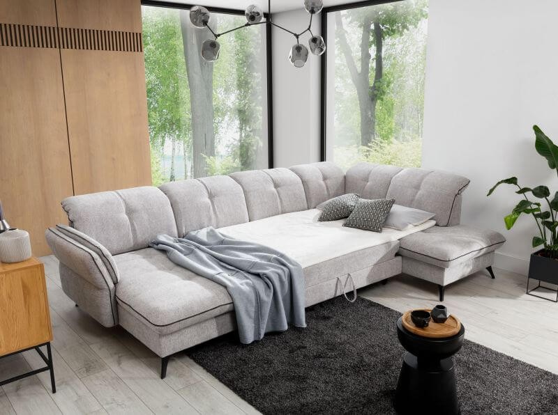 Narożnik MASSIMO GRANDE uwielbia otwarte przestrzenie, w których jakość liczy się bardziej niż ilość. Jest to luksusowy narożnik, który sam w sobie nada pomieszczeniu charakteru. Wykonany jest z wytrzymałych surowców. Kolorystyka jest niewątpliwie stonowana, która wprowadzi do wnętrza harmonię, porządek i szyk. Czarne lamówki, oraz nóżki pojawiają się w wyważonej formie dekoracji. Funkcja spania, oraz dwa pojemniki na pościel to z pewnością najważniejsza zaleta kanapy. MASSIMO GRANDE rozjaśni pomieszczenie. Mebel jest w całości obity materiałem, dlatego może stać w samym centrum pomieszczenia. Tkanina obiciowa jest niezwykle delikatna, ale tez wytrzymała i plamoodporna. Posiada też regulowane zagłówki, a jest to jedna z najwygodniejszych opcji w kanapach.