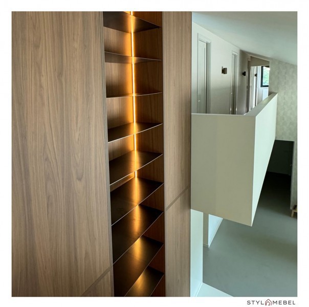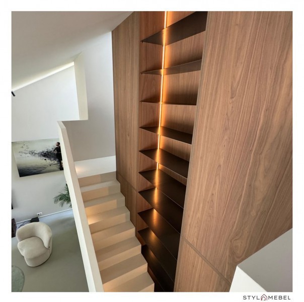 Nasza realizacja to pełna zabudowa szafy za schodami, wykonana z forniru, z eleganckimi, stalowymi półkami oraz subtelnym oświetleniem LED.