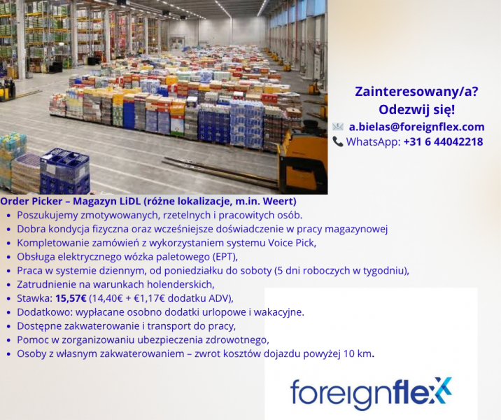 Agencja Pracy Foreign Flex poszukuje pracowników na magazyny Lidla w Holandii.