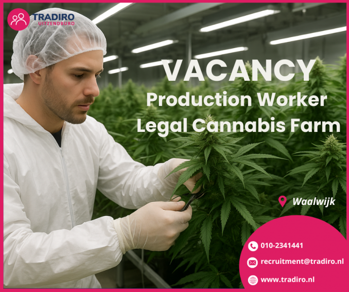 Tradiro is looking for enthusiastic production workers for a unique opportunity at a leading legal cannabis farm in Waalwijk. With over 10 years of experience and a team of more than 130 dedicated employees, this company is a pioneer in the sector. Here, cannabis is grown to the highest standards. As a proud participant in the Closed Coffeeshop Chain Experiment, the company produces high-quality natural raw materials from cannabis for scientific, medicinal and recreational purposes.
