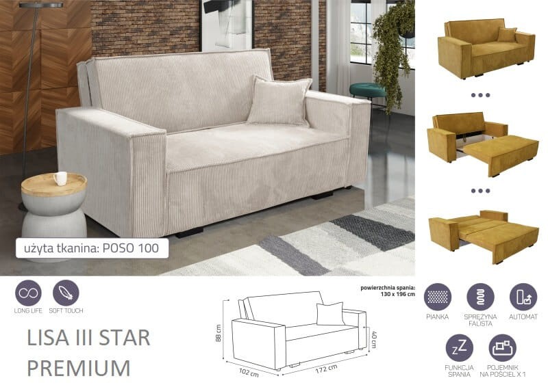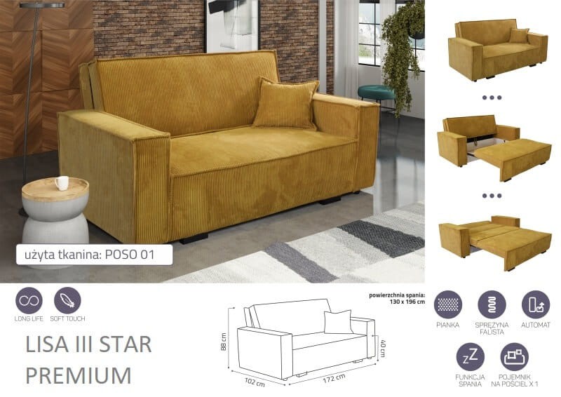 Automat ułatwiający rozkładanie gwarantuje lekkie i wygodne użytkowanie w codziennym życiu. Wypełnienie siedziska sprężyną i pianką zapewnia komfortowy sen i odpoczynek. Pojemnik na pościel ukryje rolę łóżka w Twoim salonie. Całość wykończona przyjemną w dotyku tkaniną sztruksową poso.