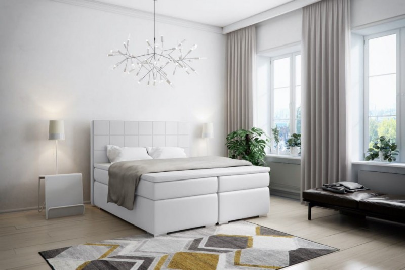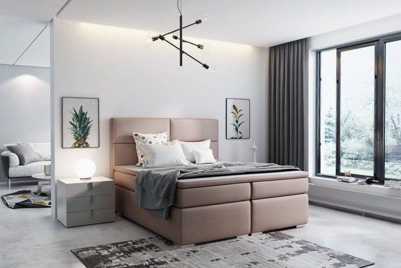 Duże łóżko boxspring z dwoma pojemnikami na pościel. Wypełnione dwoma materacami typu BONELL. Duże pojemniki na pościel otwierane osobno pomieszczą dodatkowe koce i poduszki. Tkaniny plamoodporne i zmywalne oraz odporne na sierść i zadrapania ułatwią utrzymanie w czystości. Duże tapicerowane wezgłowie.