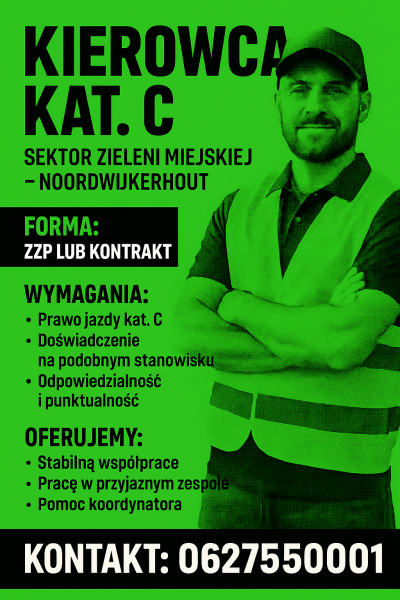 Szukamy kierowcy kategorii C do pracy w sektorze zieleni miejskiej. Praca polega na transporcie sprzętu, roślin i odpadów zielonych pomiędzy lokalizacjami w Noordwijkerhout oraz wsparciu zespołu w pracach terenowych.