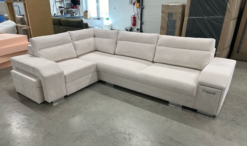 Nowoczesna luksusowa kanapa narożna z funkcją spania. Wyposażony w niezbędne funkcję i nowoczesne udogodnienia. Modny, solidny i elegancki mebel, który połączy funkcję salonu i sypialni w jednym pomieszczeniu. Wykonany przy użyciu najwyższej wysokiej jakości materiałów, gwarantujących wieloletnie użytkowanie.