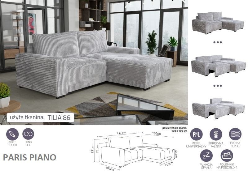 Narożnik PIANO to kanapa, która garściami czerpie z nowoczesnego designu. Tkanina, którą obito kanapę dodaje uroku, delikatności i nieprzesadnej elegancji. Czarne drewniane nóżki świetnie akcentują całość, nadając konstrukcji lekkiego charakteru. Grube siedzisko wykonane zostało z miękkiej pianki, dzięki której mebel jest niezwykle wygodny i można na nim przesiadywać długie godziny. Ze względu na swoje nieduże gabaryty idealnie sprawdzi się w małych kawalerkach, czy mniejszych salonach. Aby w pełni wykorzystać miejsce zajmujące przed kanapę, dołożyliśmy funkcje spania, oraz pojemnik na pościel, dzięki czemu nie będziesz już miał problemu z przenocowaniem gości.