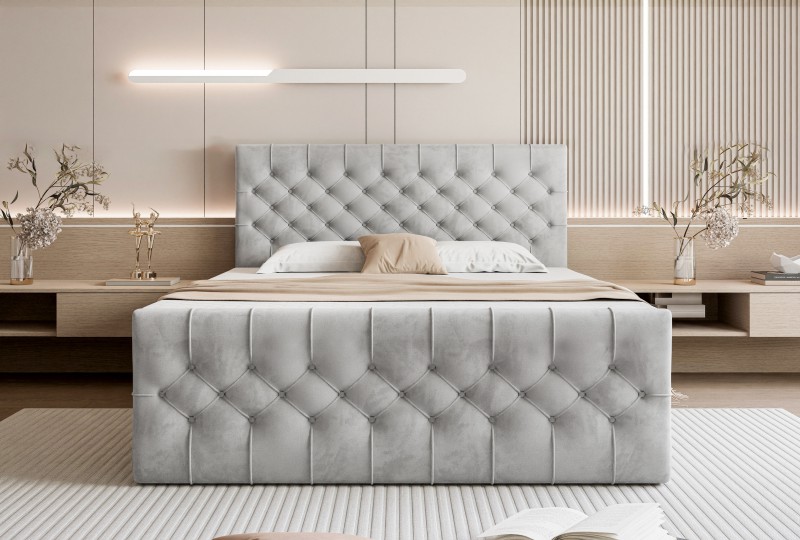 Wyjątkowe podwójne łóżko sypialniane z 2 pojemnikami na pościel. Zamieni sypialnię w wyjątkowy apartament. Wysokie tapicerowane pikowane wezgłowie oraz wysoki przednóżek dodają całości wyjątkowego charakteru. Dostępne w 5 rozmiarach zarówno do małej, jak i dużej sypialni.