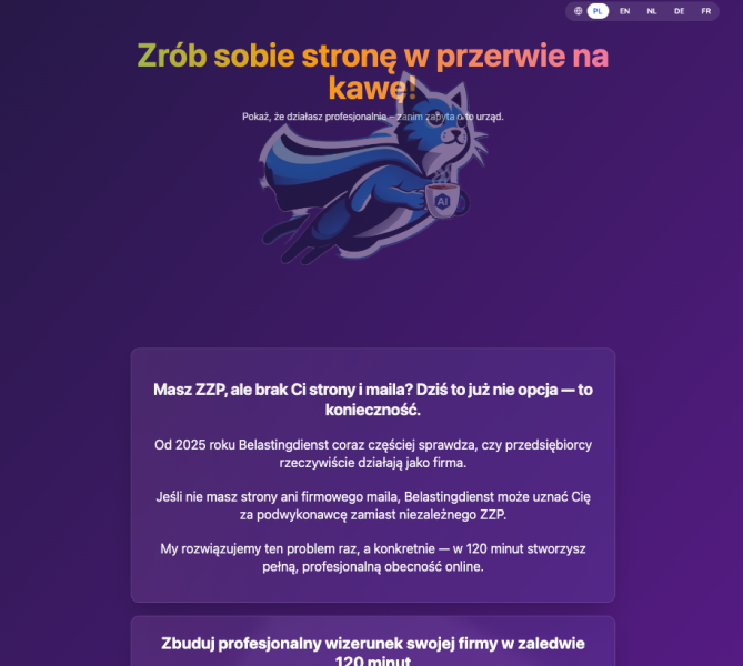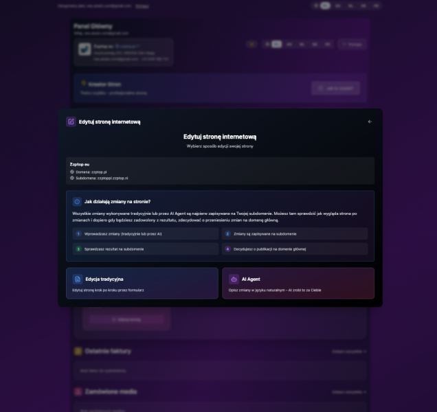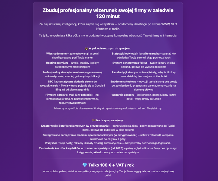 Wypełnij prosty formularz, a sztuczna inteligencja stworzy dla Ciebie stronę, e-mail, SEO i hosting – automatycznie.