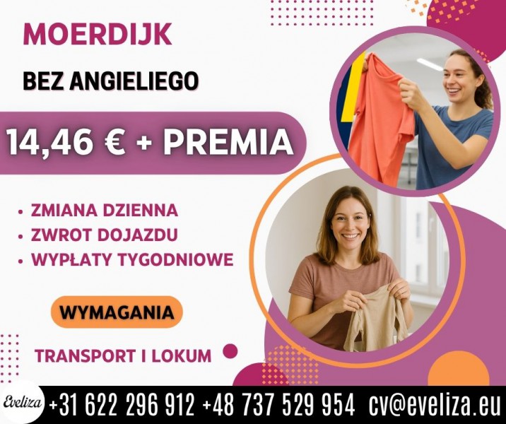 W zakładzie odzieżowym bez wymogu znajomości języka angielskiego 14,46 € + PREMIA