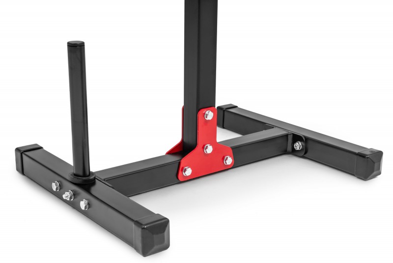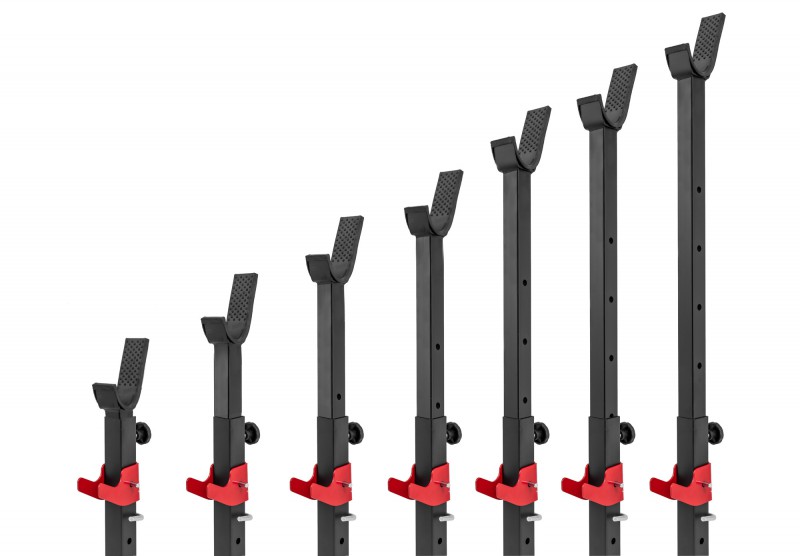 Zastosowany w stojakach, system regulacji wysokości umożliwi Ci dopasowanie narzędzia do swoich aktualnych wymagań treningowych. Do dyspozycji masz szeroki, siedmiopoziomowy zakres położenia – od 87 do 145 cm. Wysokość stojaków ustawiasz za pomocą pokrętła dociskowego oraz stalowej przetyczki blokującej.