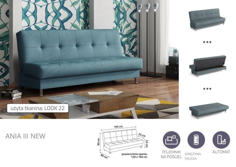 Kanapa z funkcją spania oraz pojemnikiem na pościel.