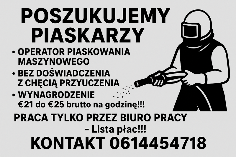 POSZUKUJEMY PIASKARZY 21 DO 25 BRUTTO OPERATOR PIASKOWANIA MASZYNOWEGO