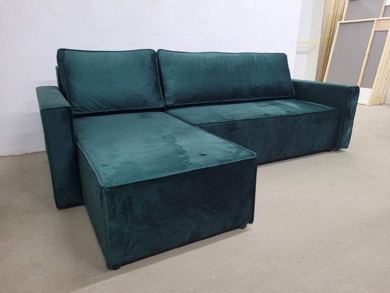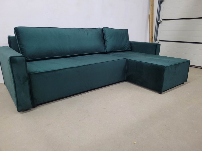 Mała kanapa narożna z funkcją spania i pojemnikiem na pościel. Wypełnieniem jest wytrzymała sprężyna bonell, która natychmiast powraca do pierwotnej formy. Głębokie siedzisko zapewnia wygodę.