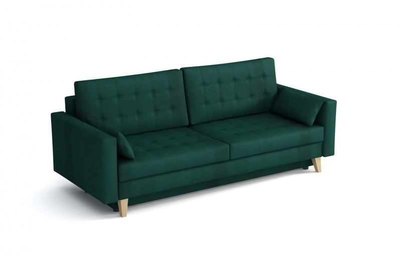 Elegancka sofa z funkcją spania i pojemnikiem na pościel. Idealna jako wygodna kanapa do pokoju młodzieżowego oraz rozkładana sofa do salonu. Wyposażona w dodatkową funkcję spania, która po rozłożeniu zamieni ją w wygodne łóżko. Pojemnik pod siedziskiem przechowa dodatkowe komplety pościeli. Dzięki łatwemu i szybkiemu składaniu i rozkładaniu łatwiej utrzymasz ład i porządek.