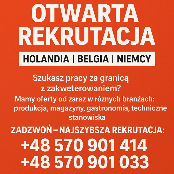 Aktualnie rekrutujemy do pracy w Holandii, Belgii i Niemczech.