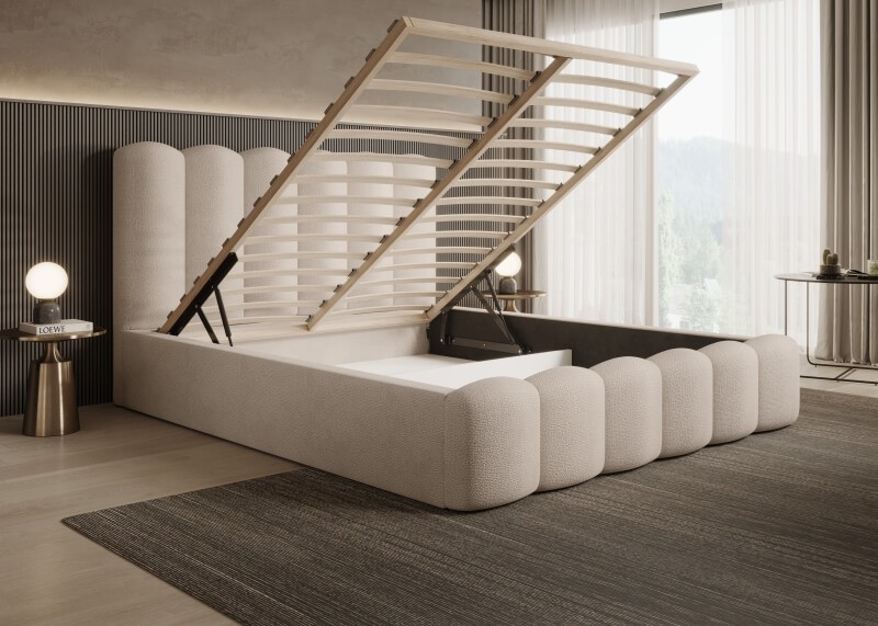 To piękne i nowoczesne tapicerowane łóżko sypialniane z pojemnikiem. Będzie zarówno wygodnym miejscem do spania, jak i ozdobą sypialni. Masywny i solidnie wykonany korpus zapewni stabilność. Duże i ciekawe wezgłowie dopełnia całości i przyciąga uwagę.