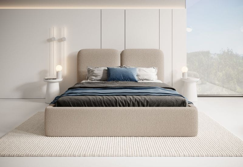 Łóżko prezentuje się zadziwiająco lekko i elegancko. Aksamitne, delikatne w dotyku obicie dodaje meblowi stylu oraz sprawia, że łóżko doskonale komponuje się praktycznie z każdą kolorystyką pokoju. Całość dopełnia nieduże i miękkie wezgłowie przypominające poduszki, dzięki czemu łóżko z wspaniale sprawdza się podczas wieczornego oglądania filmów czy czytania książki.