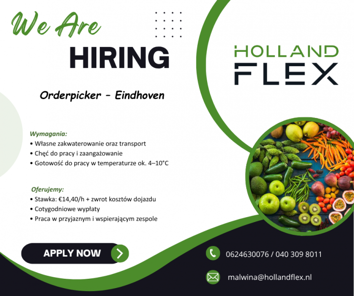 Holland Flex poszukuje pracowników na stanowisko orderpickera w Eindhoven. Praca odbywa się w dziale świeżych produktów, w kontrolowanej temperaturze, w przyjaznym i wspierającym zespole. Jeśli szukasz stabilnego zatrudnienia i cenisz sobie jasne zasady współpracy — zapraszamy.