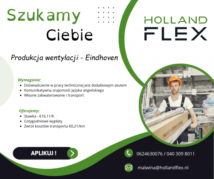 Agencja Holland Flex poszukuje kandydatów do pracy przy produkcji systemów wentylacyjnych w Eindhoven.